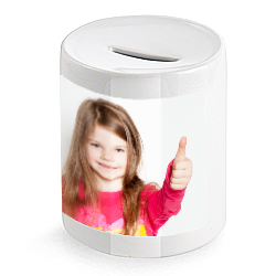 Spardose aus Keramik mit Einwurfschlitz oben und Entnahmeloch mit Gummistopfen unten.